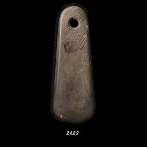 Praire County, Arkansas. Drilled effigy pendant. Complete medium size example. Has rounded ends and all edges are rounded. Was drilled through from both sides near the narrow end. Was shaped, ground and polished allover. Previously collected by Kent Westbrook (3" X 1-1/8") E.B